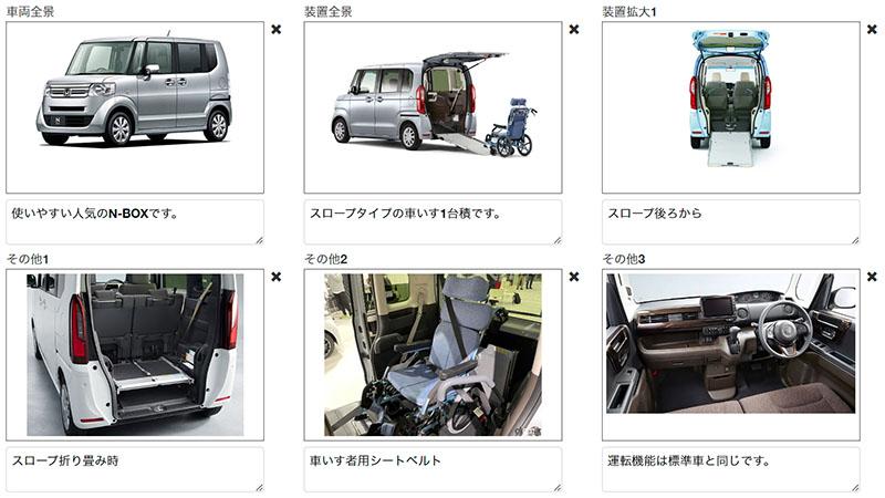 車両の外観・内観や、福祉車両特有の装置の写真を登録できます。予約サイトからの予約時や業販予約の際、確認できます。