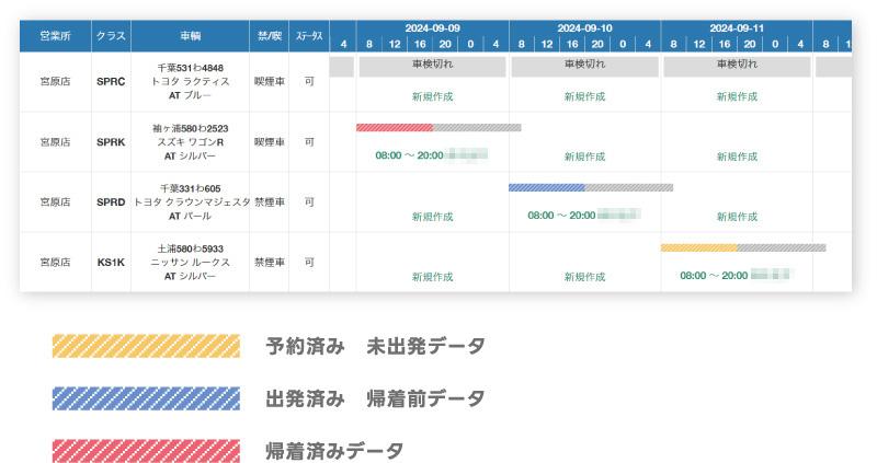 「空車検索」機能で、車両ごとに入っている予約をグラフィカルに確認可能です。「予約修正」「出発処理」「帰着処理」もすべてこの画面からおこなえます。