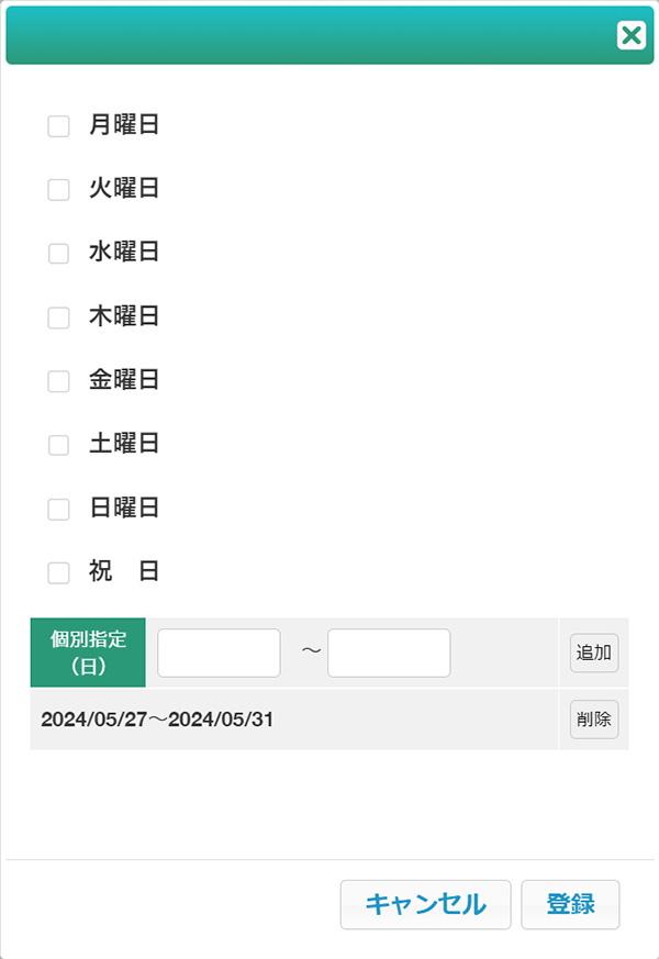 定休日を設定できます。曜日定休、個別指定、1/1のみが選択可能です。
