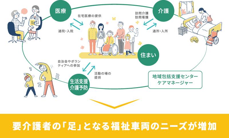地域包括ケアシステムにおいて、高齢者は、必要に応じて住まいから病院や介護施設、老人クラブなどに移動することになり、足となる福祉車両のニーズも必然的に増加すると見込まれています。